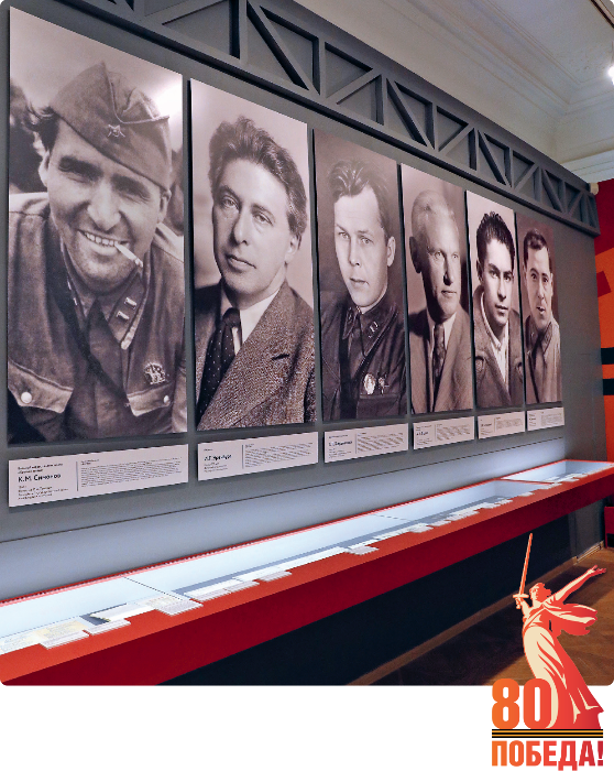 Среди экспонатов — несколько страниц иллюстраций художника Ореста Верейского к поэме Александра Твардовского «Василий Теркин» и рукописный отрывок романа Александра Фадеева «Молодая гвардия». Документы Всеволода Багрицкого, который отправился на фронт в 19 лет военным корреспондентом, пробыл на войне всего два месяца и погиб при налете вражеской авиации. В его полевой сумке осталось стихотворение «Ожидание»: «Но, побеждая, надо уметь / Ждать негодуя, ждать и терпеть».