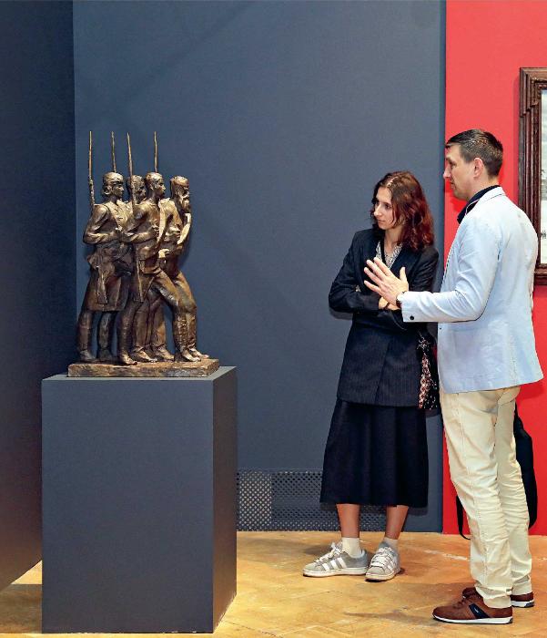 На этот вопрос отвечает следующий раздел — «Эхо прошедшей войны». Пожалуй, самый пронзительный. В него вошли произведения, которые не просто рассказывают о военных событиях, но передают весь ужас пережитого, раскрывая глубину человеческих страданий, — как драматичная серия «Опаленные огнем войны» Гелия Коржева и скульптурная композиция Даниэля Митлянского «Наш класс 9 мая 1983 года».