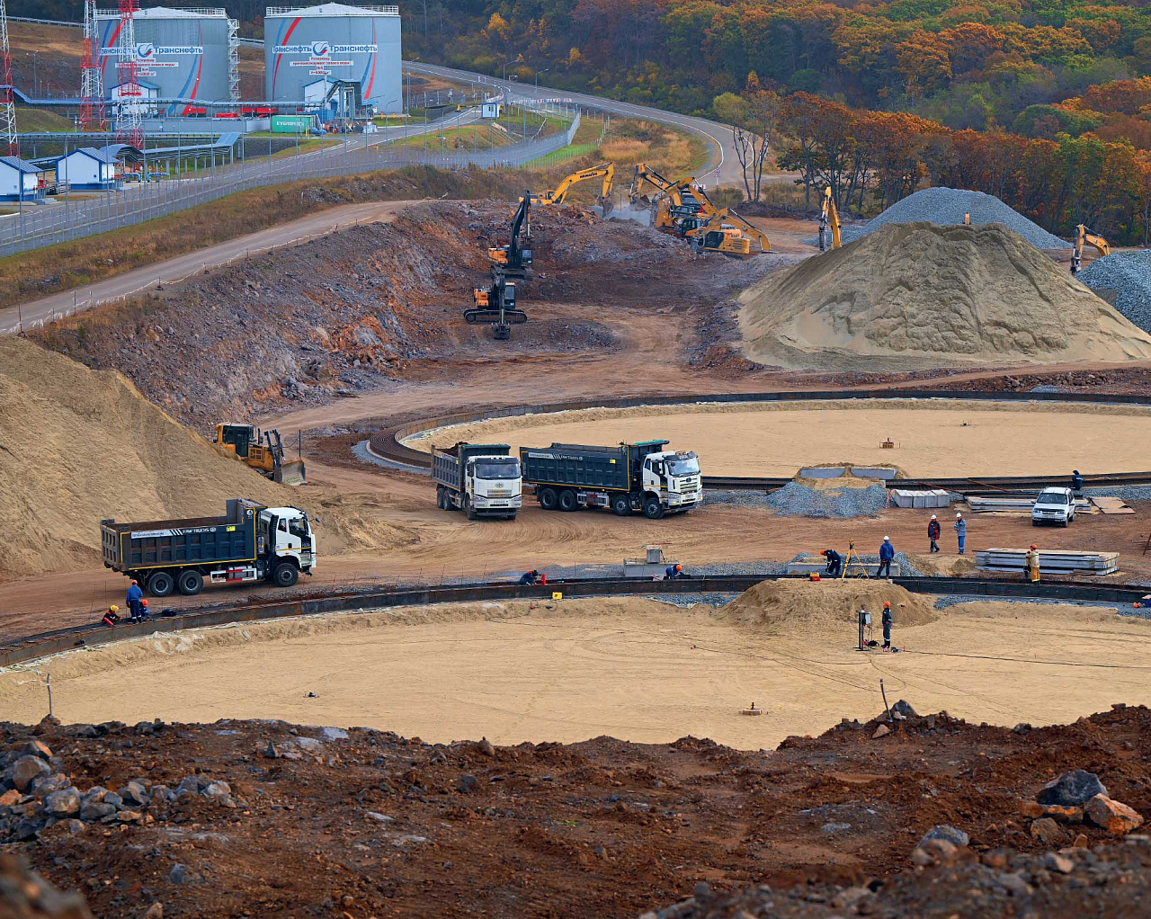Еще одна дальневосточная стройка развернулась на объектах ООО «Транснефть — Порт Козьмино». На данный момент это самый масштабный объект в рамках инвестпроекта — на нефтебазе порта возводятся три РВСПК-50000. Здесь все только начинается: готовы фундаменты под два резервуара, на площадке третьего еще идут земляные работы. Место невероятно красивое — строительная площадка находится прямо на скале над Японским морем. Эта природная красота заставила еще на стадии проекта принимать особые меры экологической безопасности.