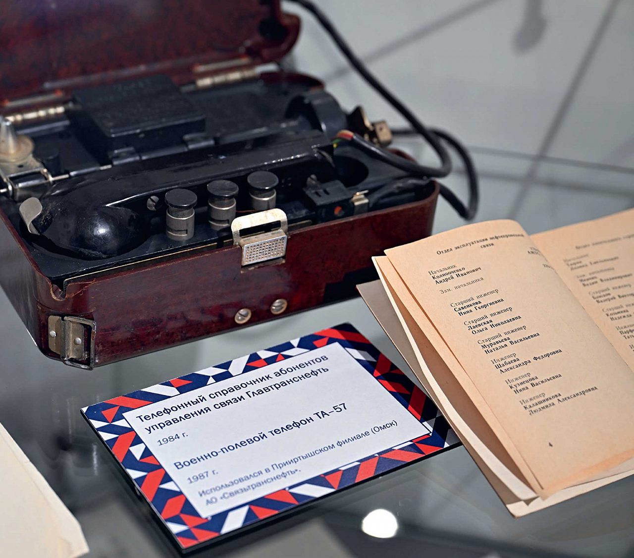 Держак сварщика с электродом, использовавшийся в сварке первого стыка ВСТО‑2. Военно-полевой телефон ТА‑57 восьмидесятых годов и телефонный справочник абонентов управления связи «Главтранснефть».