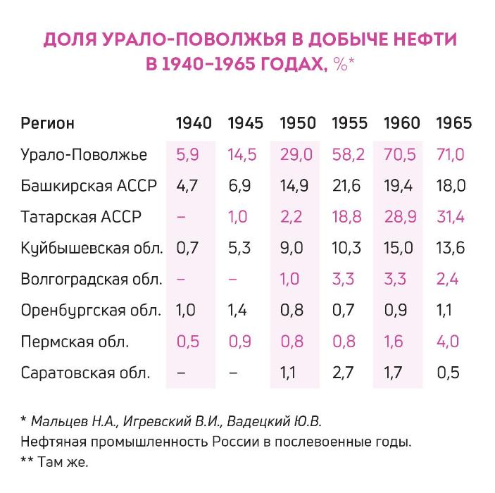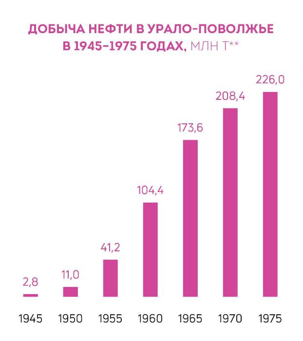 К 1950 году Урало-Поволжье обеспечивало примерно 30% добычи нефти в стране, а по запасам почти вдвое опережало Азербайджан. В первые послевоенные годы были открыты крупнейшие месторождения — Ромашкинское в Татарстане, Мухановское в Куйбышевской области и другие. В 1955 году удельный вес добычи Урало-Поволжья достиг 58,4%, стремительный рост которой поставил задачу создать сеть магистральных трубопроводов для транспортировки сырья на нефтеперерабатывающие заводы. Уже в 1947 году была проложена магистраль Туймазы — Уфа, спустя два года еще одна — до Бугуруслана в Оренбуржье.