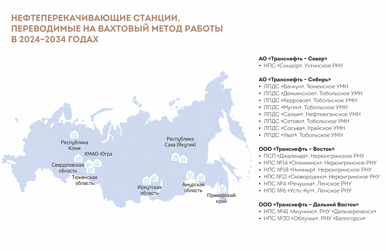 Вахтовый метод применяется при значительном удалении места работы от места постоянного проживания работников — в необжитых, отдаленных районах или районах с особыми природными условиями. До 2023 года в системе «Транснефть» насчитывалось около 50 станций, работающих вахтовым методом. Затем эта практика получила новый импульс в свете решения задач по обеспечению укомплектованности объектов ОСТ квалифицированными кадрами. Новый план перевода производственных объектов на вахтовый метод работы был утвержден в 2023–2024 годах, в него вошли 18 НПС четырех предприятий: АО «Транснефть — Север», АО «Транснефть — Сибирь», ООО «Транснефть — Восток» и ООО «Транснефть — Дальний Восток».