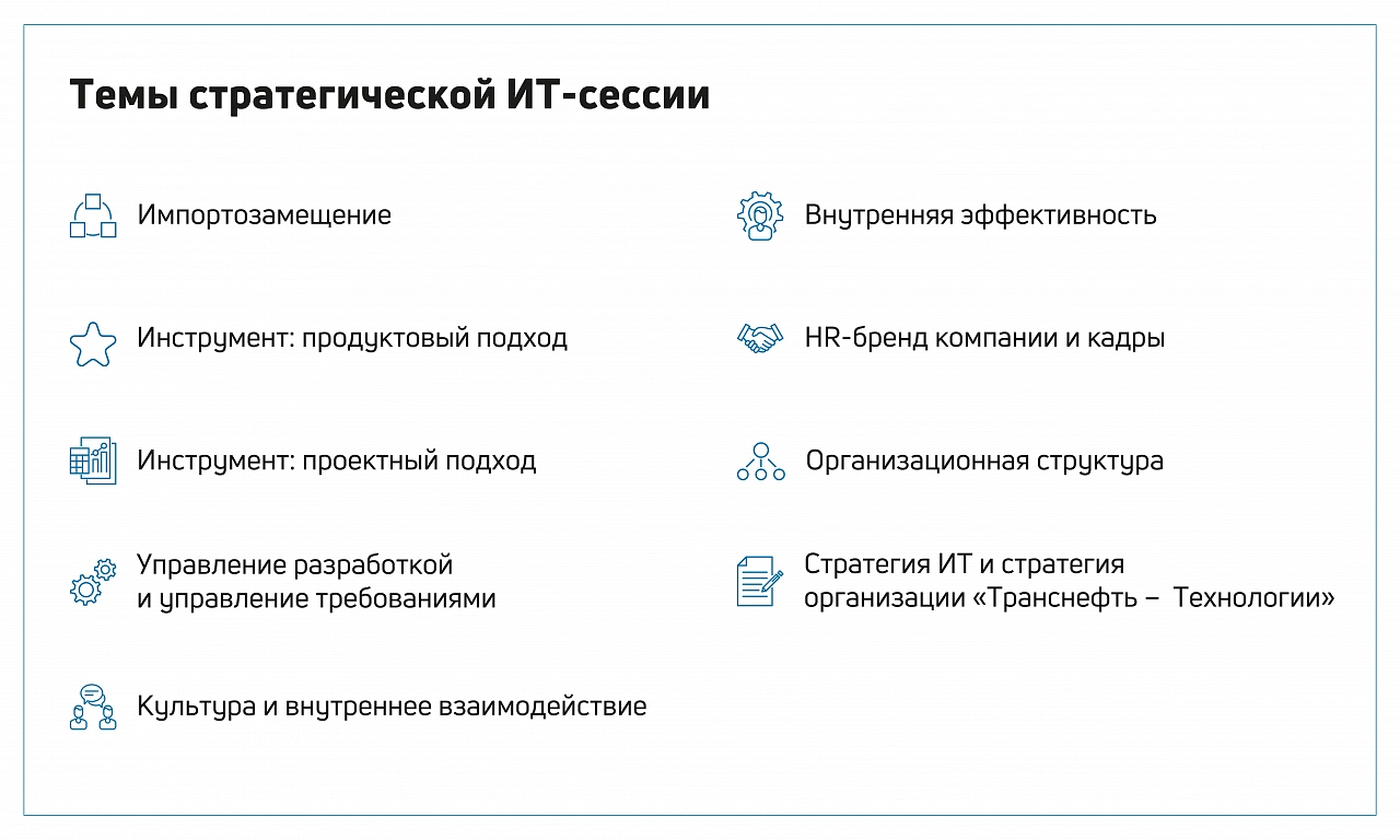 Стратегическая сессия стала первым тематическим корпоративным мероприятием, собравшим ключевых экспертов компании в области информационных технологий (ИТ). Работа была построена в командах. У каждой — своя тема. Все вопросы — конкретные, наболевшие, предложенные жизнью. Команды сами определяли наиболее острые проблемы по своему направлению, четко формулировали задачу и искали решения.Многие вопросы пересекались, и практически всех затронули импортозамещение, кадровая политика, отношения с функциональным заказчиком, которым для ИТ‑блока являются производственные подразделения компании.