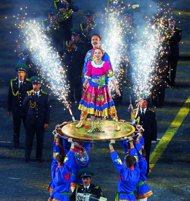 Коронный номер и у Центрального пограничного ансамбля ФСБ России: пышные фейерверки, залихватский русский танец передают российский размах «от Волги до Енисея».