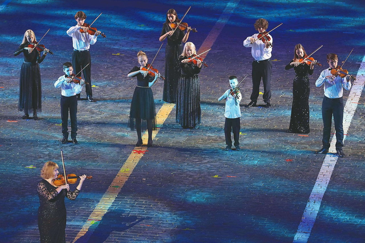 Под хиты «Земля в иллюминаторе» и сюиту «Время, вперед!» музыканты выстраиваются ракетой и «летят» вокруг Земли. Артисты из Армении открывают зрителям «голос армянской души» дудук и в ритме танца отмечают юбилей фестиваля, выстроившись в римскую цифру XV. Белорусы впечатляют народными песнями под волынку и приемами построения — «солнцем» и «волной». А юные скрипачи из струнного ансамбля «Веселые нотки», приехавшие из Луганска — города-побратима Москвы, коллектив на фестивале выступает впервые, покорили публику композицией «Гори, гори, моя звезда». Отклик на трибунах мгновенный — зрители встают, включают фонарики на телефонах, раскачивают ими в такт музыке, кричат «браво».