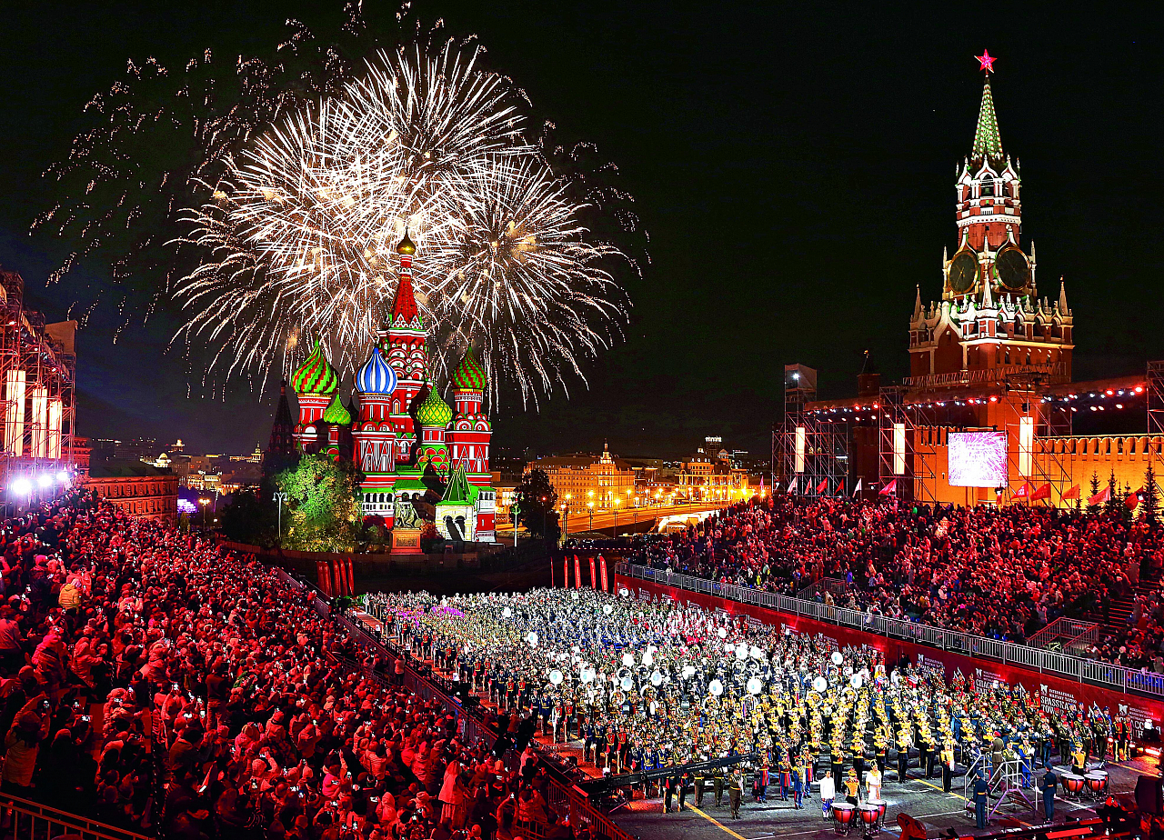 — Говорит и показывает Москва, слушайте и смотрите Красную площадь! Просьба включить ваши телефоны. Снимайте, выкладывайте в социальных сетях, делитесь незабываемой атмосферой «Спасской башни», — призывает ведущий вечера. Зрители горячо откликаются фотовспышками смартфонов, особенно когда дают залп ракетницы. «Спасская башня» гремит не только в Москве — она в топе мировых площадок military tattoo. Под овации публики в сонме звука, цвета и света музицируют, маршируют, танцуют, поют и шутят военные оркестры из России, Белоруссии, Армении, Египта и Венесуэлы, а также музыкальные коллективы из Таиланда и Индии. Увидеть сразу салют над кремлевскими звездами, изыски дефиле военных музыкантов, а также слонов, чинно выступающих в такт ритуальным танцам, можно лишь раз в году. Брусчатка не страдает — фиолетовые слоны, сопровождающие чарующие па индийского коллектива «Пангхат» («Берег реки»), инсталлированы на стенах и куполах собора Василия Блаженного.