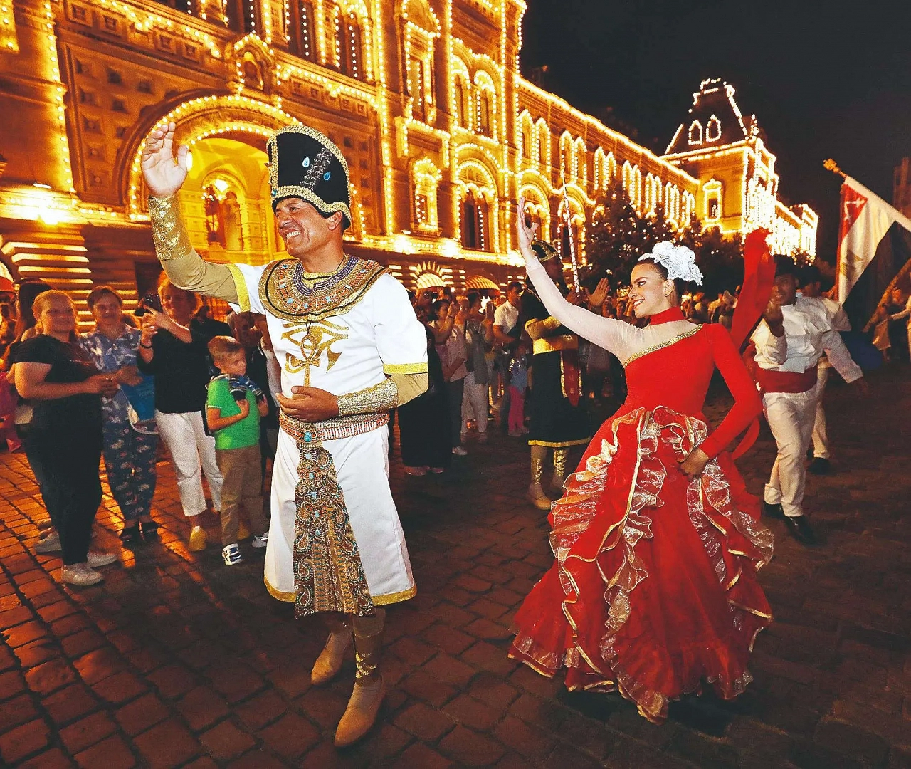 По брусчатке Красной площади марширует оркестр из Египта. Зрители приветствуют потомков страны пирамид и угощают их конфетами. «Фараоны» улыбаются, позируют для фото, не переставая играть «Катюшу». А под ее аккомпанемент, подхватив импровизацию, в зажигательном танце кружатся артисты из Венесуэлы, привлекая к выступлению прохожих.