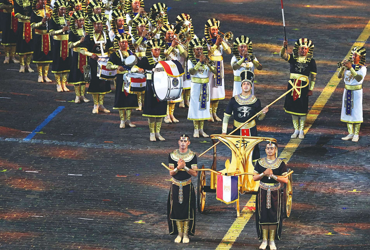 Почти полсотни мощных световых приборов и бог солнца Ра озаряют выход Военного симфонического оркестра Египта, облаченного в одежды фараонов и бойцов древней египетской армии. У себя на родине этот оркестр сопровождал транспортировку мумий в Национальный музей египетской цивилизации в Эль-Фустате и открытие Аллеи Сфинксов в Луксоре. В Москве музыканты удивляют широтой российского репертуара: «Русский вальс» Шостаковича, «Катюша» и «Москва, звонят колокола», под которые оркестр показательно объезжает колесница Рамзеса II.