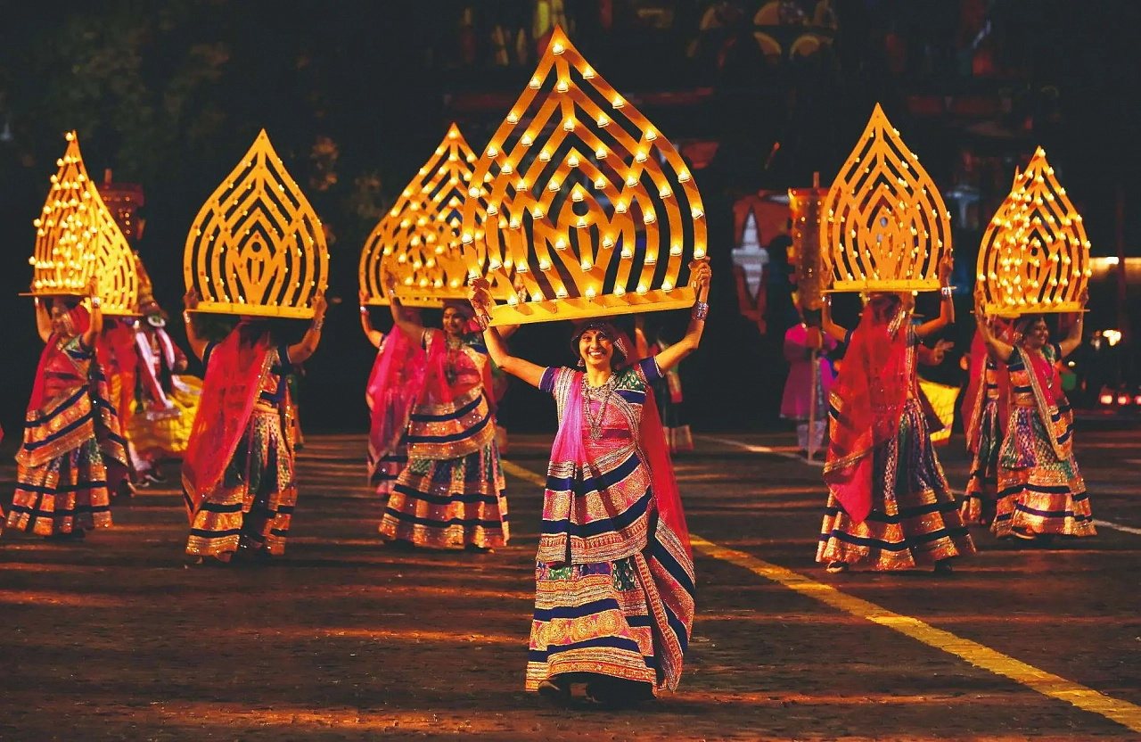 Тяжелые костюмы, исполинских размеров головные уборы, напоминающие кокошники, и полсотни лампочек-свечей — во всем этом индийский коллектив восхваляет богов. В помощь — музыкальные инструменты с необычными названиями: ханг, манджира, гугра, кандери, дулак.