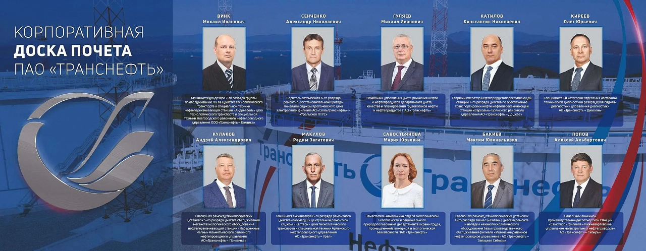 На Доске почета ПАО «Транснефть» размещены фотопортреты следующих особо отличившихся работников ПАО «Транснефть» и организаций системы «Транснефть»: