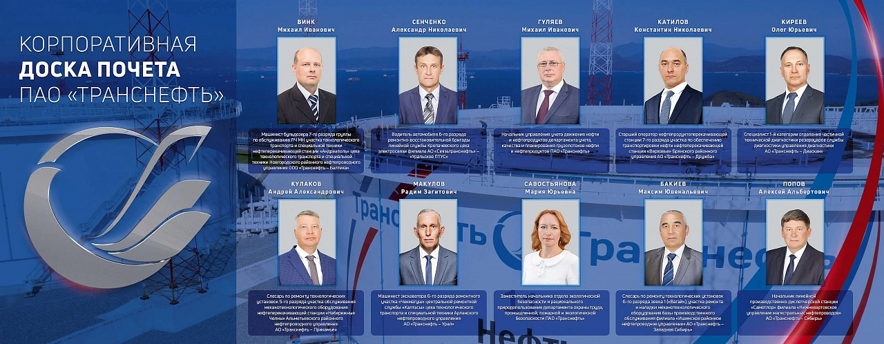 На Доске почета ПАО «Транснефть» размещены фотопортреты следующих особо отличившихся работников ПАО «Транснефть» и организаций системы «Транснефть»: