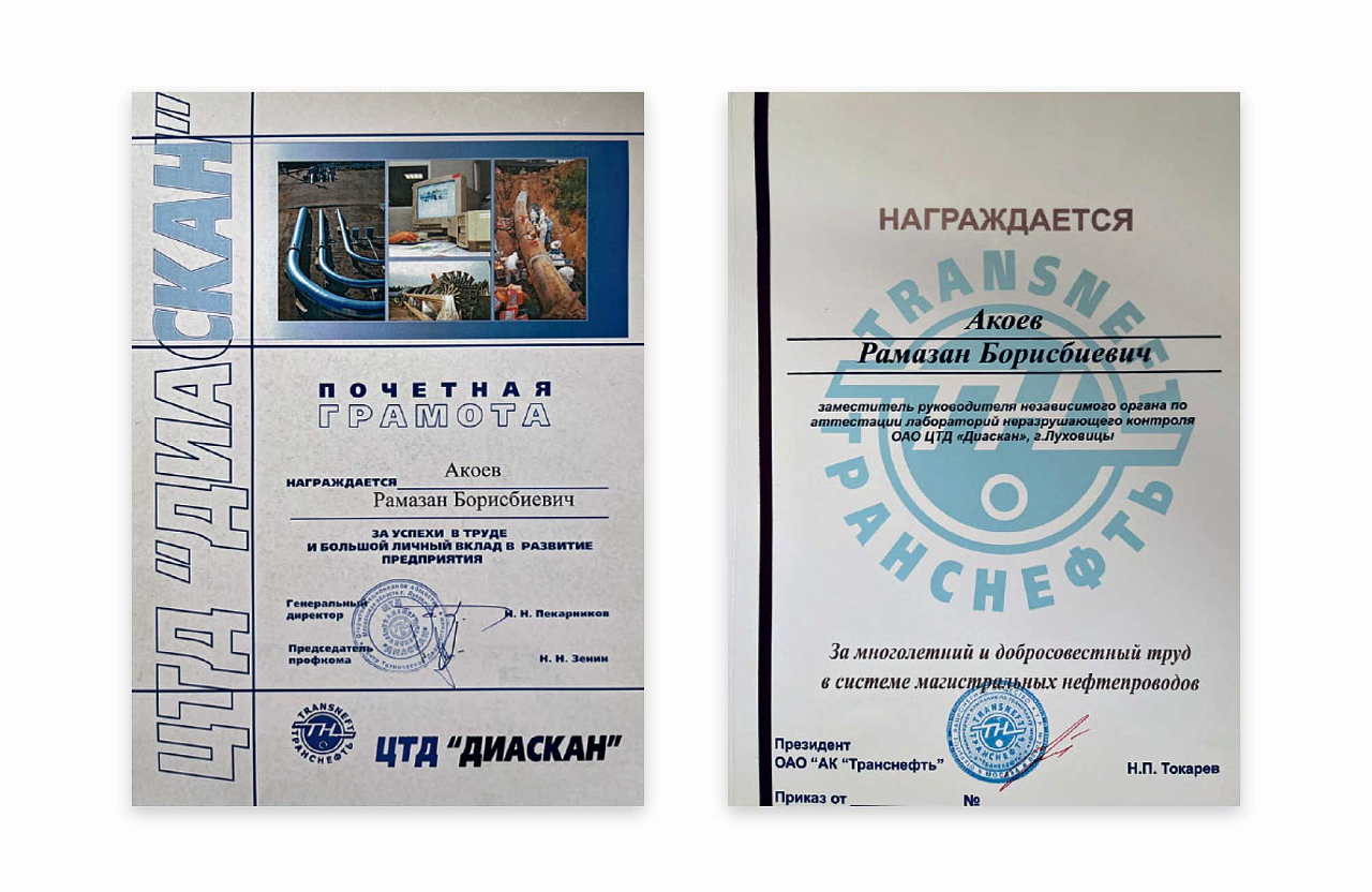 За консультацией к Рамазану Акоеву обращаются коллеги из соседних лабораторий и других предприятий системы «Транснефть». Он побывал на многих объектах и главных стройках компании, в том числе исследовал сразу после монтажа участок линейной части первой очереди нефтепровода Восточная Сибирь — Тихий океан. Награжден благодарностями и почетными грамотами предприятия, знаком «Ветеран системы «Транснефть». Среди его достижений — описание нового дефекта.