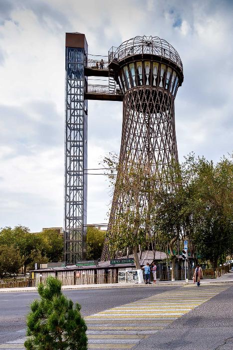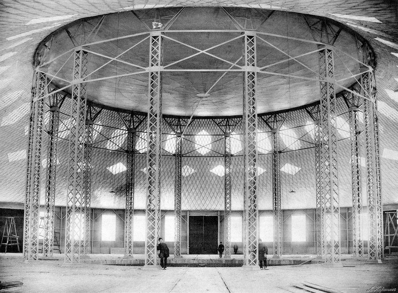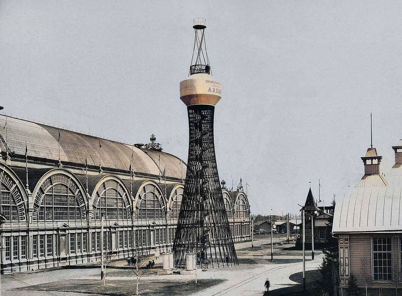 А в 1896 году взошла звезда Шухова как архитектора, когда над павильонами на нижегородской Всероссийской промышленной выставке 1896 года вознеслись «крыши без стропил» на общей площади 22,5 тыс. м2. Зрители удивлялись, глядя на первую гиперболическую водонапорную башню по проекту инженера. После этого в знак особого отличия фирме Бари разрешили использовать на бланках и в рекламных буклетах герб Российской империи. Для резервуаров Шухов разработал непроницаемые висячие крыши. «Только металлические конструкции дадут архитекторам широко использовать плавные изогнутые формы. Пока это не понято в полной мере», — гласит запись в записной книжке Владимира Шухова. В то время единственным зодчим, кто, как и Шухов, использовал в своих конструкциях форму гиперболоида, был великий испанский архитектор Антонио Гауди.