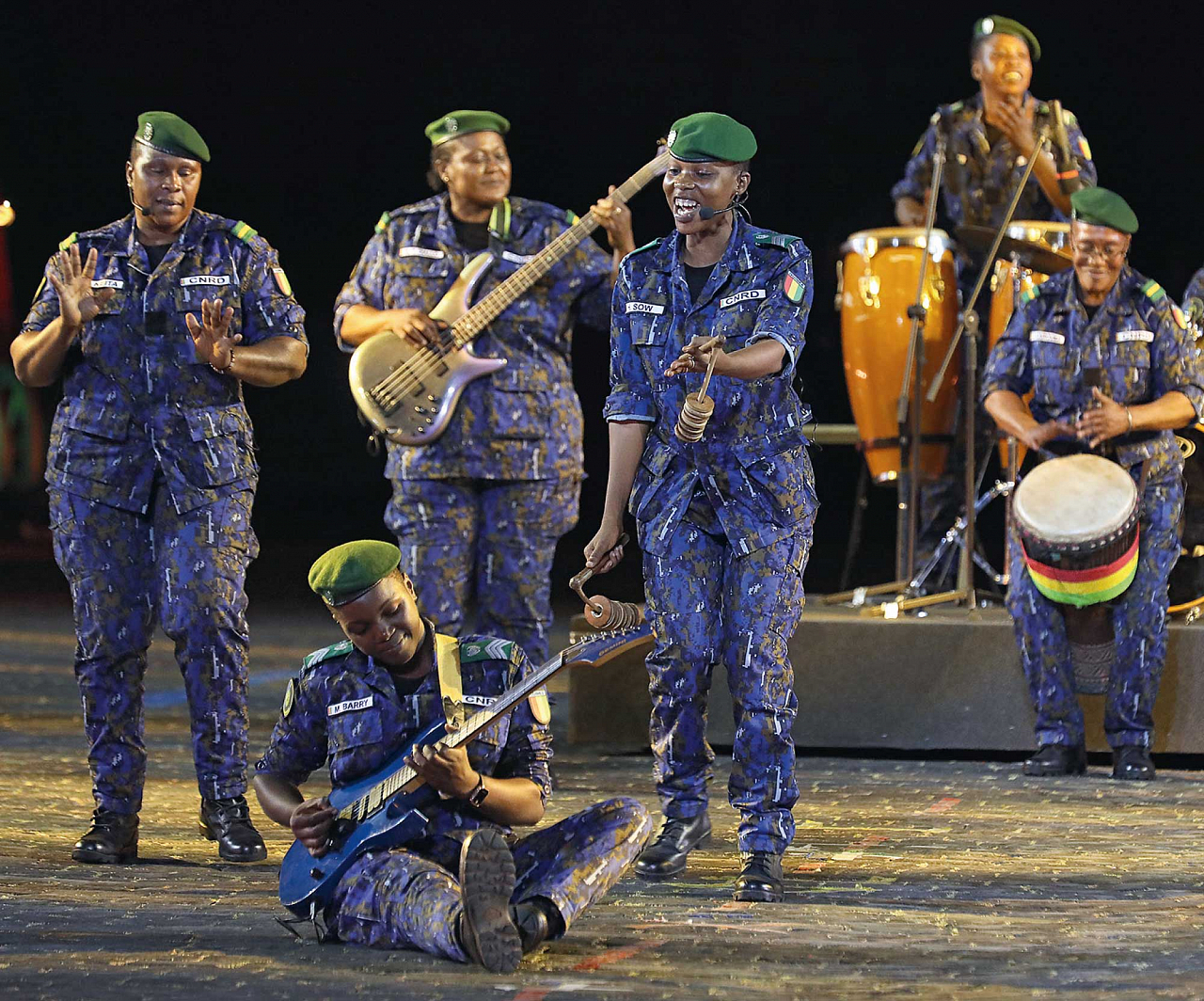 Иная техника — у участников первого африканского женского оркестра Национальной жандармерии «Амазонки Гвинеи»: имитация древних приемов устрашения врага. Оркестр создал в 1961 году министр обороны страны как символ нового мышления и отказа от пережитков прошлого. Старые песни про освобождение женщины от феодального гнета оставлены в прошлом. Сегодня амазонки с электрогитарами, саксофонами и джазовой ударной установкой повествуют о новой гвинейской женщине. Но военная форма напоминает: они смогут за себя постоять.