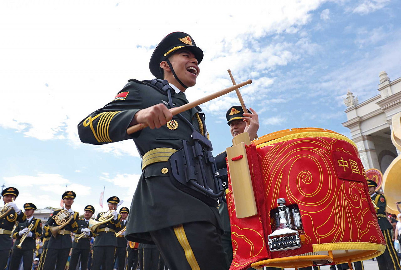 «Армия и народ в едином порыве» — музыкальный десант из Китая приветствует «Спасскую башню», встав в форме пятиконечной звезды. А под «Марш стальных частей» (знатоки утверждают, что он перекликается с маршами Красной армии) выстраивается цифрой «75» — музыка написана к 75‑летию основания КНР. «75» — и дата установления дипломатических отношений между Россией и Поднебесной. И уже высоте пронзительного звука китайской дудочки рукоплещут трибуны: солист демонстрирует превосходную физическую форму, полминуты не прерываясь на вдох.