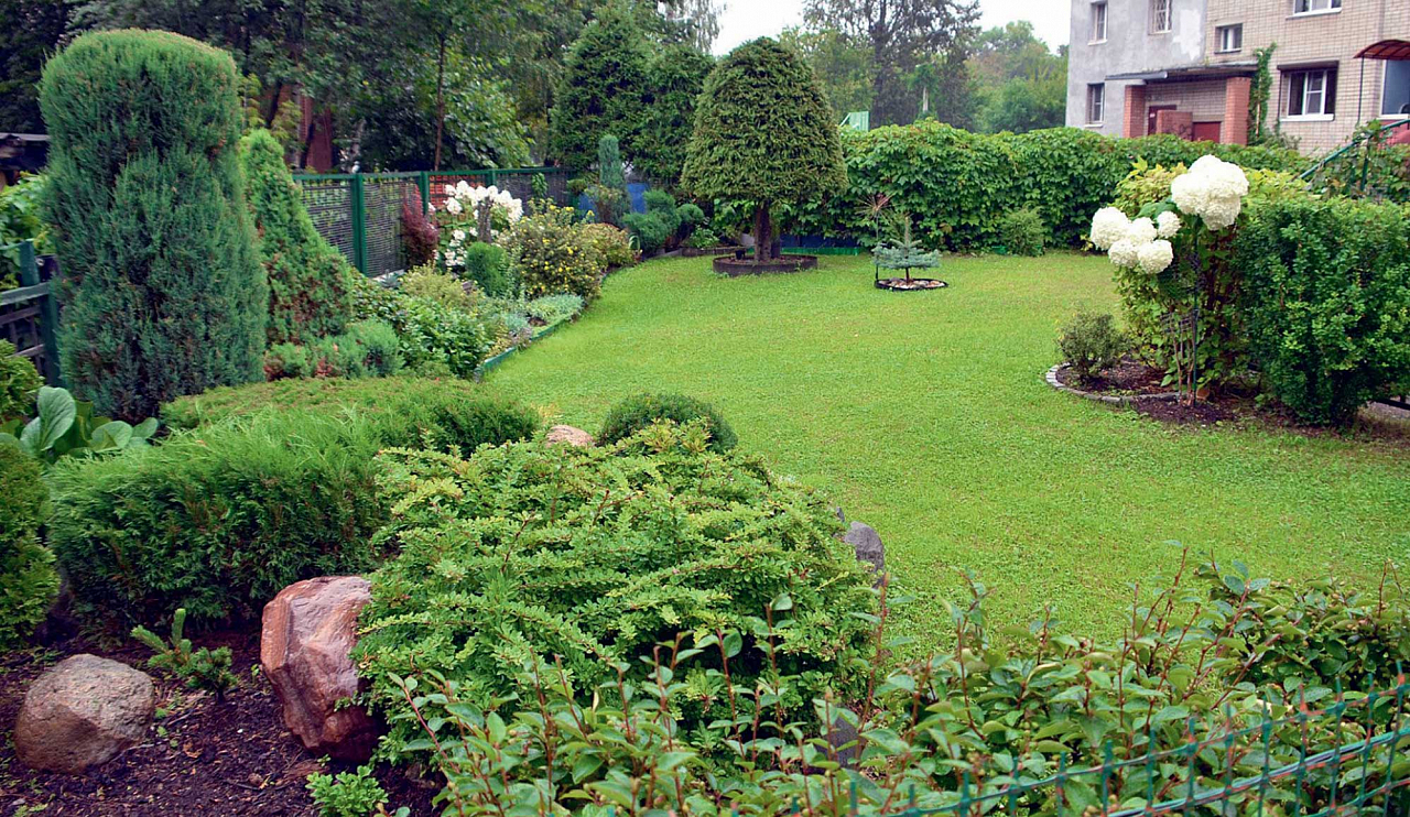 Сейчас многоэтажка утопает в цвету. В саду вокруг нее — более двухсот деревьев и кустарников: различные сорта липы, рябины, клена, каштана, ели, чубушника, пузыреплодника, дерена, самшита, туи, можжевельника, пять видов гортензий. Самые любимые у Александра — краснолистная черемуха, бересклет европейский крылатый, изящная вавилонская ива.