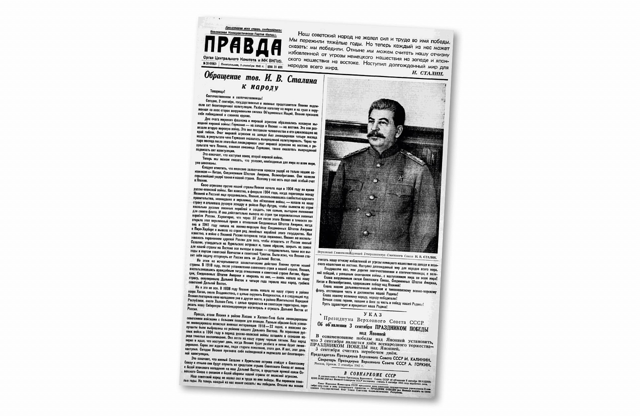 <…> Наш советский народ не жалел сил и труда во имя победы. Мы пережили тяжелые годы. Но теперь каждый из нас может сказать: мы победили. Отныне мы можем считать нашу Отчизну избавленной от угрозы немецкого нашествия на западе и японского нашествия на востоке. Наступил долгожданный мир для народов всего мира.