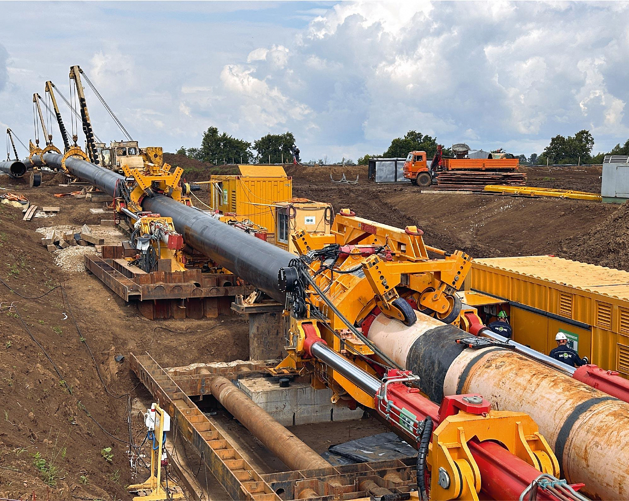 Строительство подводного перехода через реку Белую, начавшееся в июне 2024 года, разделено на три основных этапа работ. Первый — это строительство линейной части и обустройство новых узлов запорной арматуры, второй, наиболее технологически сложный — выполнение прокладки футляра методом ГНБЩ и третий — демонтаж трубопровода Ду 500 мм. На третьем этапе есть свои осложненные участки: переход через озеро протяженностью 264 м, три закрытых перехода через автомобильные дороги общей протяженностью 114 м. Пик строительно-монтажных работ пришелся на май 2025‑го и продолжается в данный момент. В ближайшее время запланировано протаскивание дюкера Ду 500 мм протяженностью более 880 м в проложенный методом ГНБЩ футляр Ду 1200 мм. Подключение запланировано на июль 2026 года после окончания паводкового и нерестового периодов. Инновационную технологию в дальнейшем планируется применять на других объектах ПАО «Транснефть». В 2026 году запланировано строительство методом ГНБЩ резервной нитки через реку Аксай.