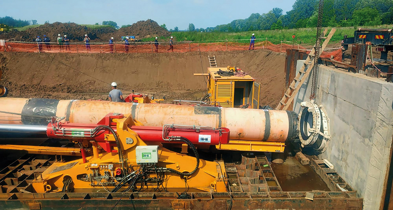 Несколько лет назад наша компания уже работала на подводном переходе через реку Белую методом горизонтально-направленного бурения, строительство тогда проходило с большим трудом и большими рисками. Почти год мы боролись с этой рекой, в результате переход был построен, но с учетом полученного опыта на этот раз ПАО «Транснефть» был выбран иной технологический метод. Основное отличие — строительство в один этап. Достичь такого результата позволяет сама технология и рабочий комплекс, который мы для этого используем. Это тоннелепроходческая машина АVN1000, она предназначена для работы с трубопроводом внутренним диаметром 1200 мм. Второй компонент — два доталкивателя труб, с их помощью обеспечивается одноэтапность работы: щитом бурится скважина и одновременно проходит протаскивание рабочего трубопровода. Процесс строительства скважины занимает 35–45 суток, это быстрее, чем методом ННБ, но подготовительный этап длится дольше.
