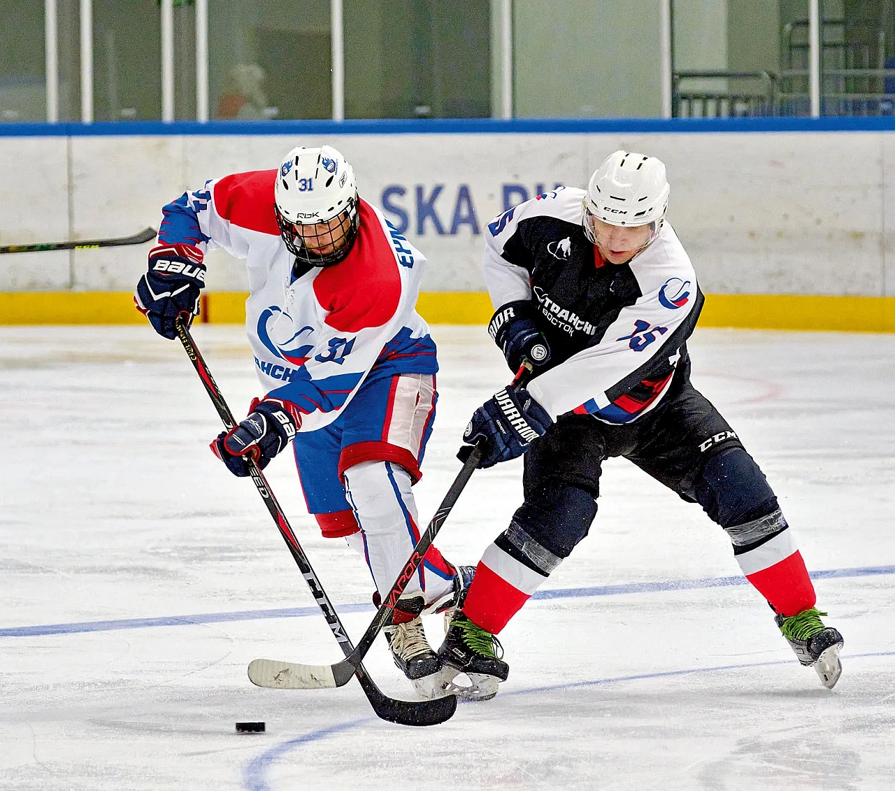 Шайба в игре. Высокая скорость. Счет практически сразу открывает с подачи Рената Яппарова его брат – нападающий ООО «Транснефть – Восток» Марат Яппаров.